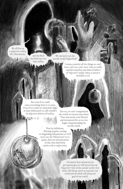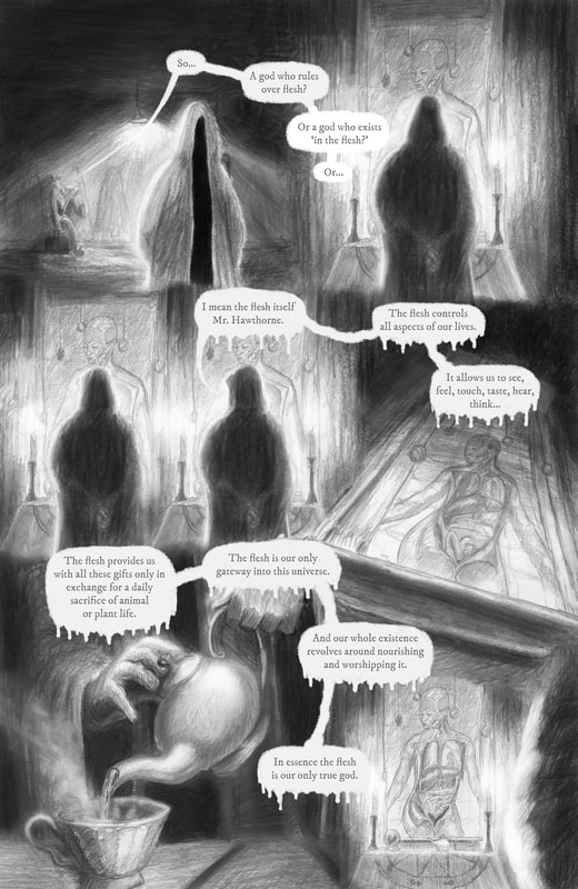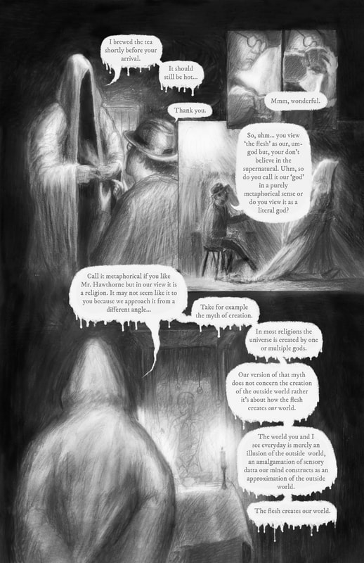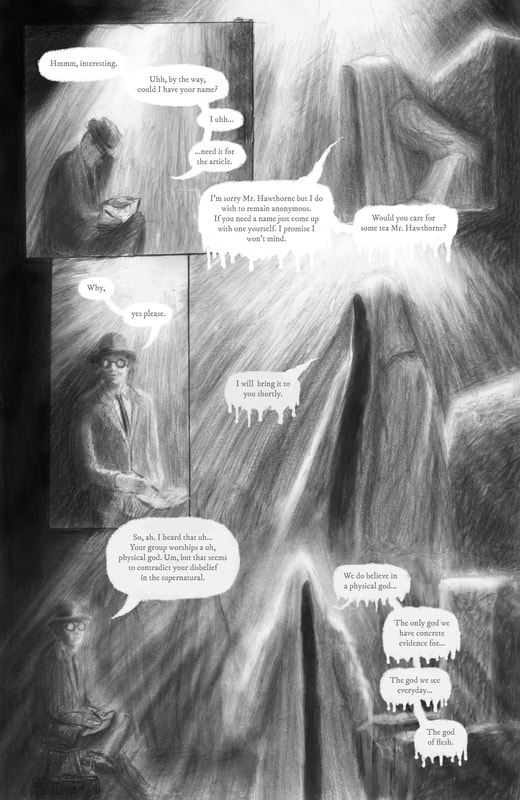 But the problem was that I needed a story, who is this man and what is the context. At first I thought of having the story be about the man slowly turning into that monstrosity but I had at that point already written 2 stories where somebody turns into some kind of monstrosity so I decided to tackle it from a different angle. So I had the idea that an outsider met with the cult that has this man. So, OK. Who is this outsider? My first thought was a journalist of some kind, maybe somebody from a newspaper or something, In my mind I had the idea of a reporter who looked like somebody from the early 20th century. I also batted around the idea of having this take place in modern times and maybe having the character be a blogger but I ultimately hated that and decided that the main character would be a journalist for a magazine. Now, OK we have this guy meeting with this cult leader and I had the idea that the big horror twist would come with the reveal of the mutilated man but besides that what do I do? At this point I realized that my previous comics were awfully narration heavy so I decided to restrict myself to only using speech bubbles, I needed to practice doing dialogue scenes. Now originally I just had the idea of the man meeting the cult leader, he would talk to them about their ideology and then the mutilated man would be revealed and it would be revealed that the cult members are also mutilated (they self mutilate). After that our character would then run out of the basement, now I wasn't sure what to do after that or if there should be anything more than that. I did some versions that played out differently (as you will see later) but eventually I decided to have the story just be about a man who meets with a cult, talks to them, sees some unimaginable horror and is forever ruined after that (very Lovecraftian). One aspect that I thought was integral was that I did not want the cult to be one-dimensional villains (although I did write one version where they were one-dimensional villains and it was just awful), in fact I kind of wanted the reader to come to an understanding of their ideology and I wanted the reader to come to their own conclusion. But if the comic is mostly just about two people talking what do they talk about? And how do you make a comic about people talking visually interesting?