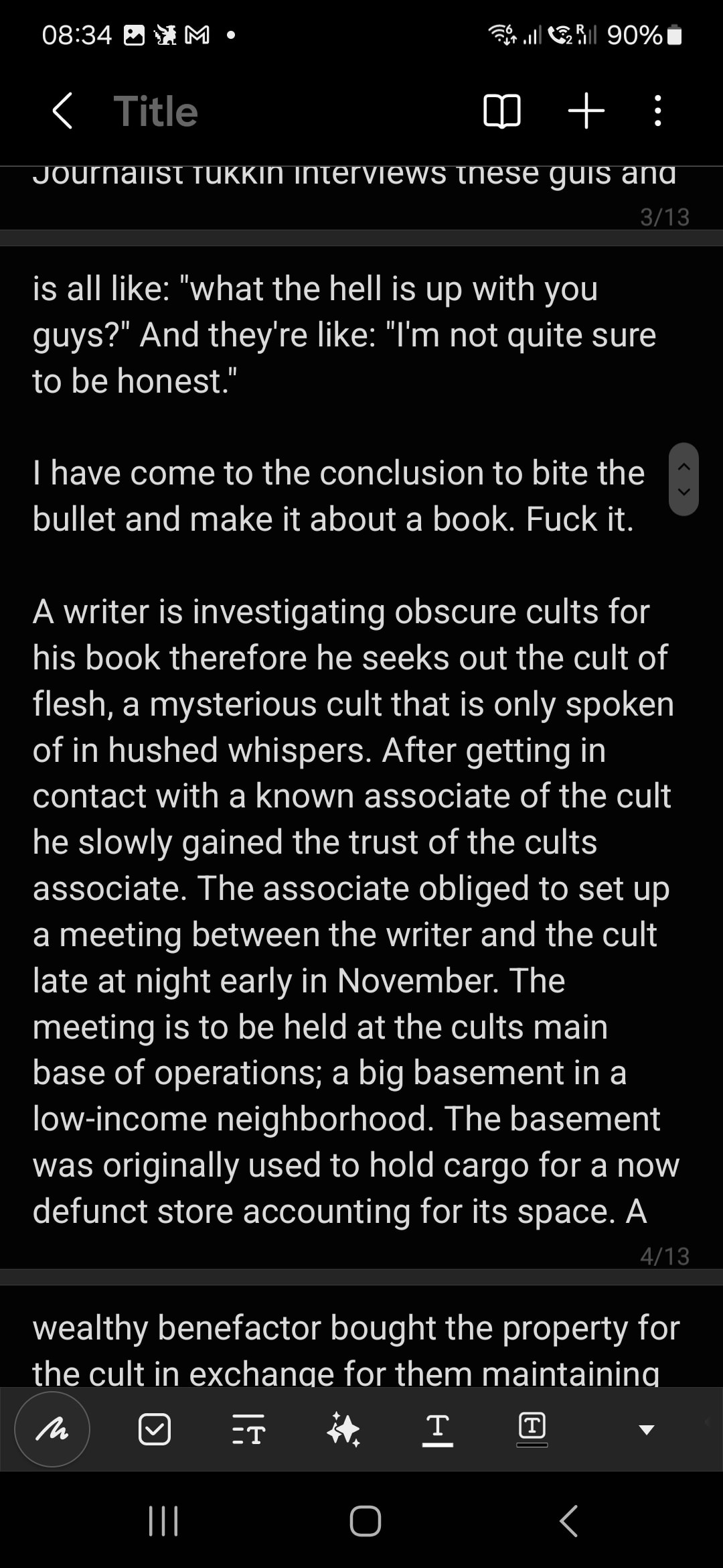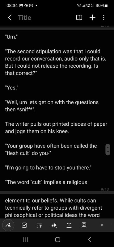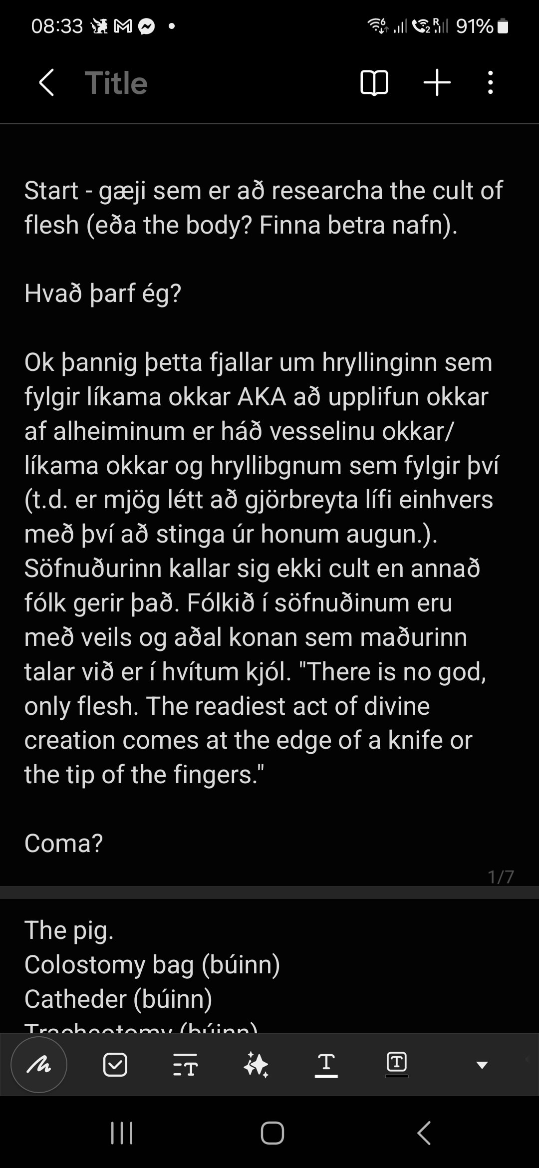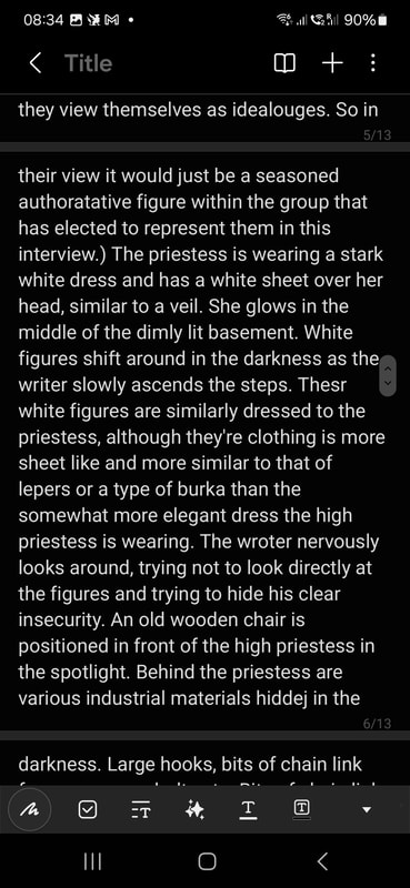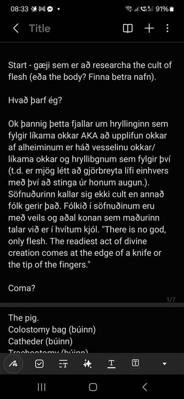 After that I decided to make the cults ideology center around the subjectivity of reality and I think I finally found a road that I'm happy with. Essentially it deals with how our reality is purely subjective and cobbled together from sensory data, not that the outside world doesn't exist but that the world we experience and our body controls how we see and experience the world. And that part of the cults ideology is that the human body is our god since it creates our experienced world and control over your own body and your own reality is the closest to godliness one can achieve. The mutilated man would be somebody who took the cults ideology to the extreme and decided to fully control his experience with reality by changing what his body therefore himself can experience with the world. This was the basis for the (then) final script and will be the basis for the actual final story.