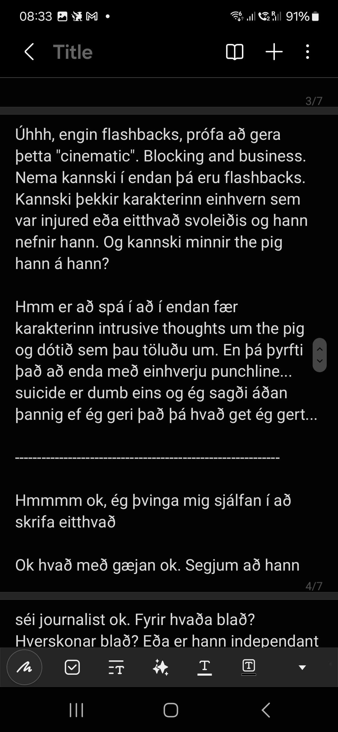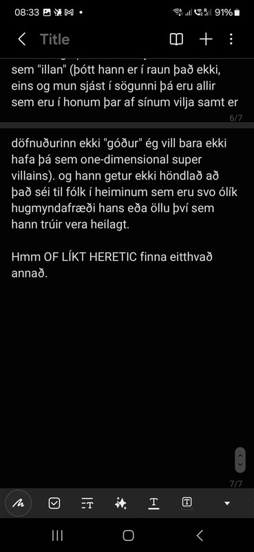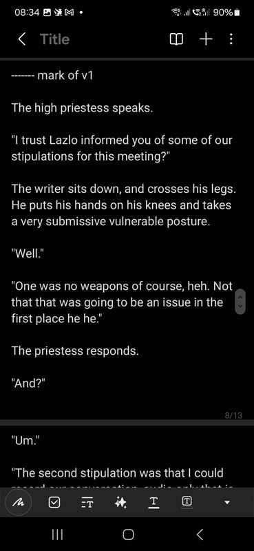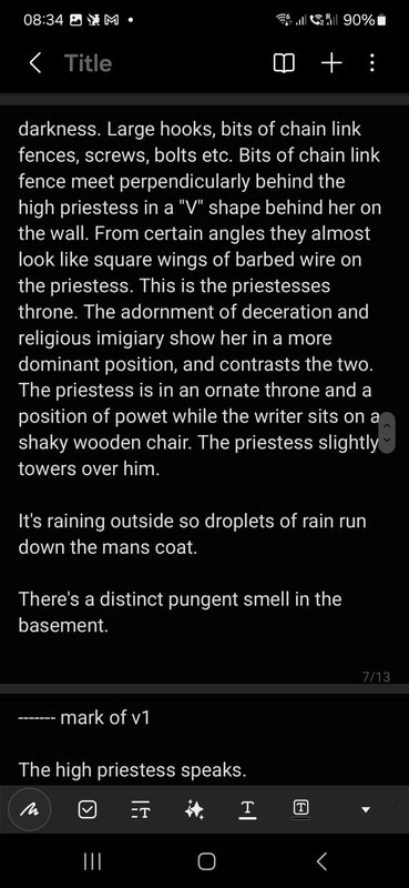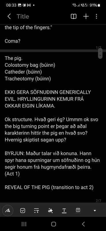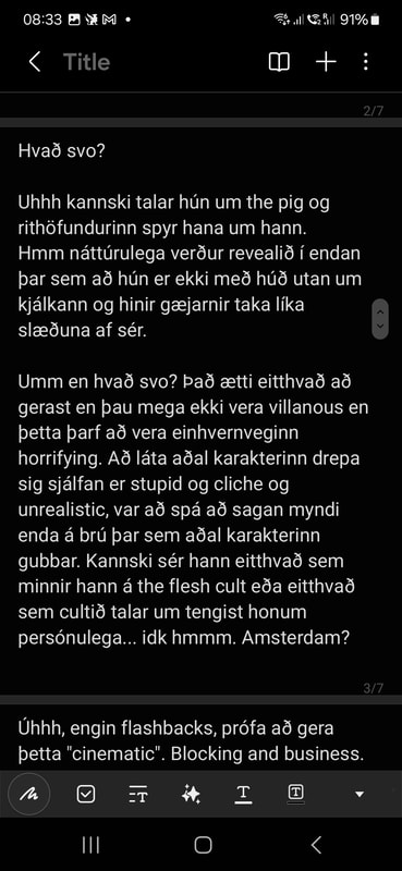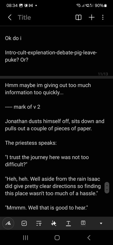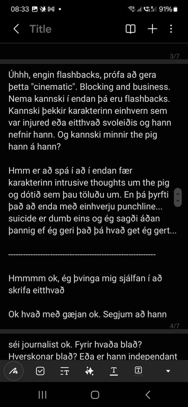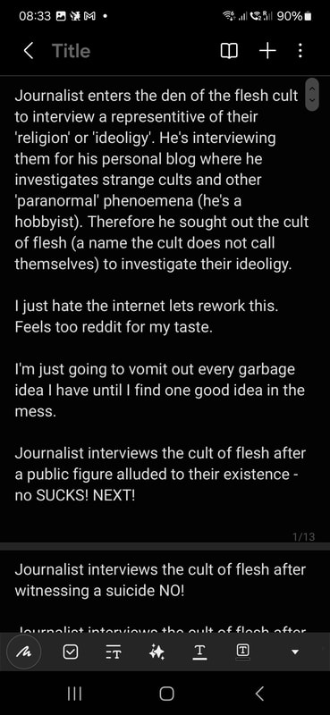 After that debacle I tried to make their conversation be about a type of nihilistic body horror. The horror of having to live life in a body that withers and dies, that there's only a couple of centimeters of skin between life and death and a denial of dualism. I'm not sure which is more embarrassing this version of the script or the older one but this one really tapped into the "14 year old who just discovered nihilism" nonsense which isn't surprising since I think you need to be pretty careful if you want to have those themes as you can easily fall into that trap, as I did. So, yeah, writing that kind of made my skin crawl and I'm currently cringing out of my skull as I write this. Also the elements about dualism and physicalism felt forced and pretentious so I scrapped that.