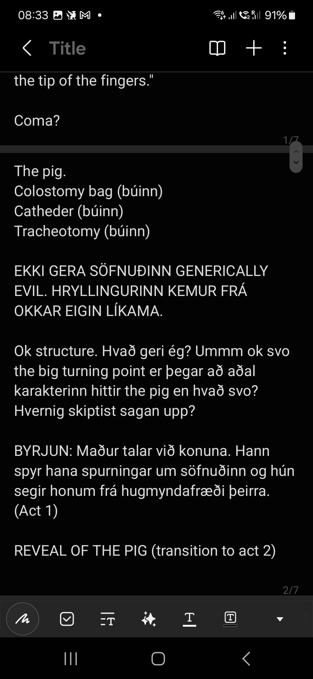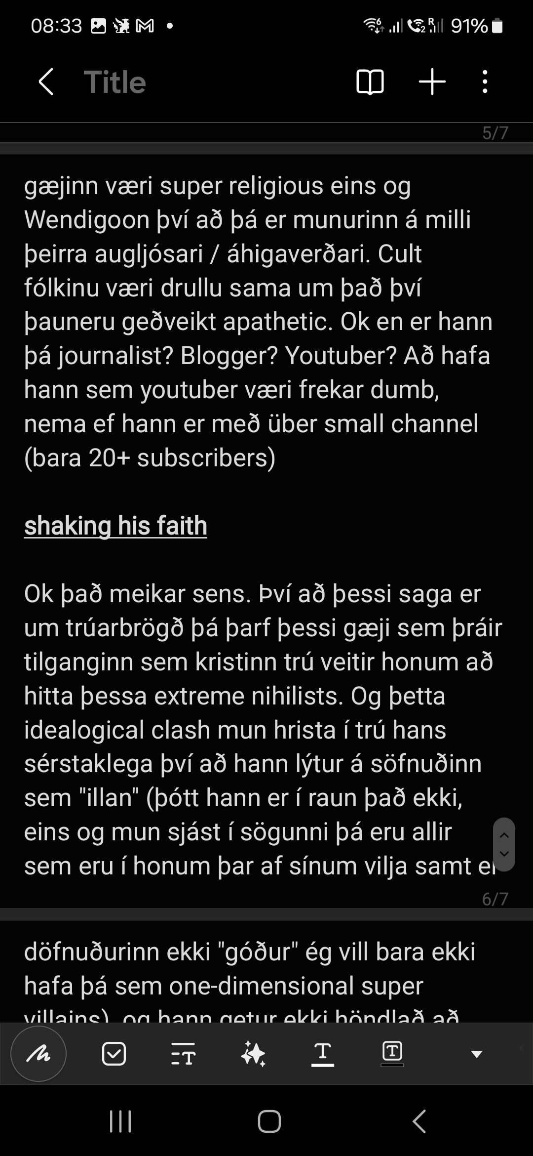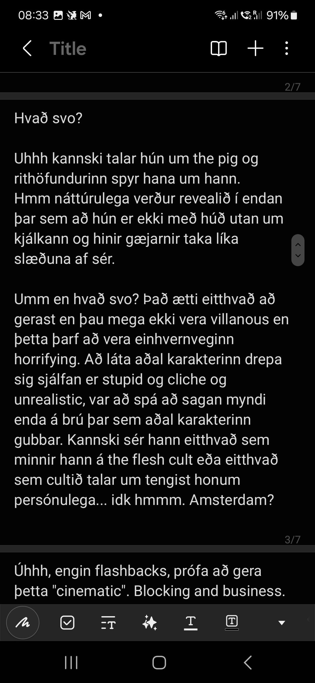 After that debacle I tried to make their conversation be about a type of nihilistic body horror. The horror of having to live life in a body that withers and dies, that there's only a couple of centimeters of skin between life and death and a denial of dualism. I'm not sure which is more embarrassing this version of the script or the older one but this one really tapped into the "14 year old who just discovered nihilism" nonsense which isn't surprising since I think you need to be pretty careful if you want to have those themes as you can easily fall into that trap, as I did. So, yeah, writing that kind of made my skin crawl and I'm currently cringing out of my skull as I write this. Also the elements about dualism and physicalism felt forced and pretentious so I scrapped that.